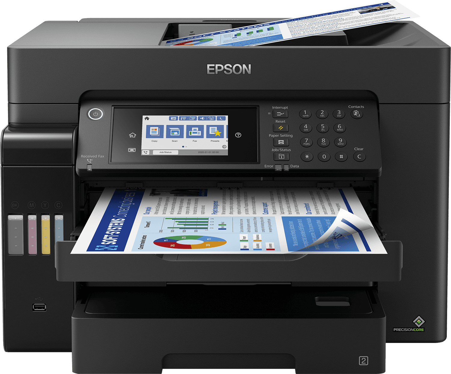 Бұл EcoTank қосымша сия қажет болғанға дейін мыңдаған парақтарды басып шығара алады, ал екі A3 қағаз науасы 500 парақты орналастырады. 50 парақтағы кең артқы берілістің және A3 форматындағы құжаттарды автоматты түрде беру құрылғысының арқасында беттерді қолмен жүктеуден босатыңыз.